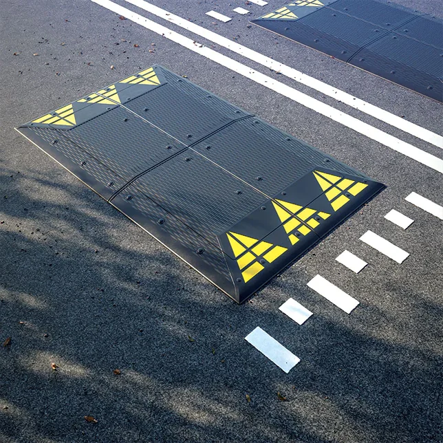 ES-SC900SC speed cushion is used to calm traffic. It ensures effective reduction of car speed, while buses, emergency vehicles, etc. can pass without having to slow down. It is recommended to install the bumps in pairs to prevent the bump from being hugged by a vehicle.
